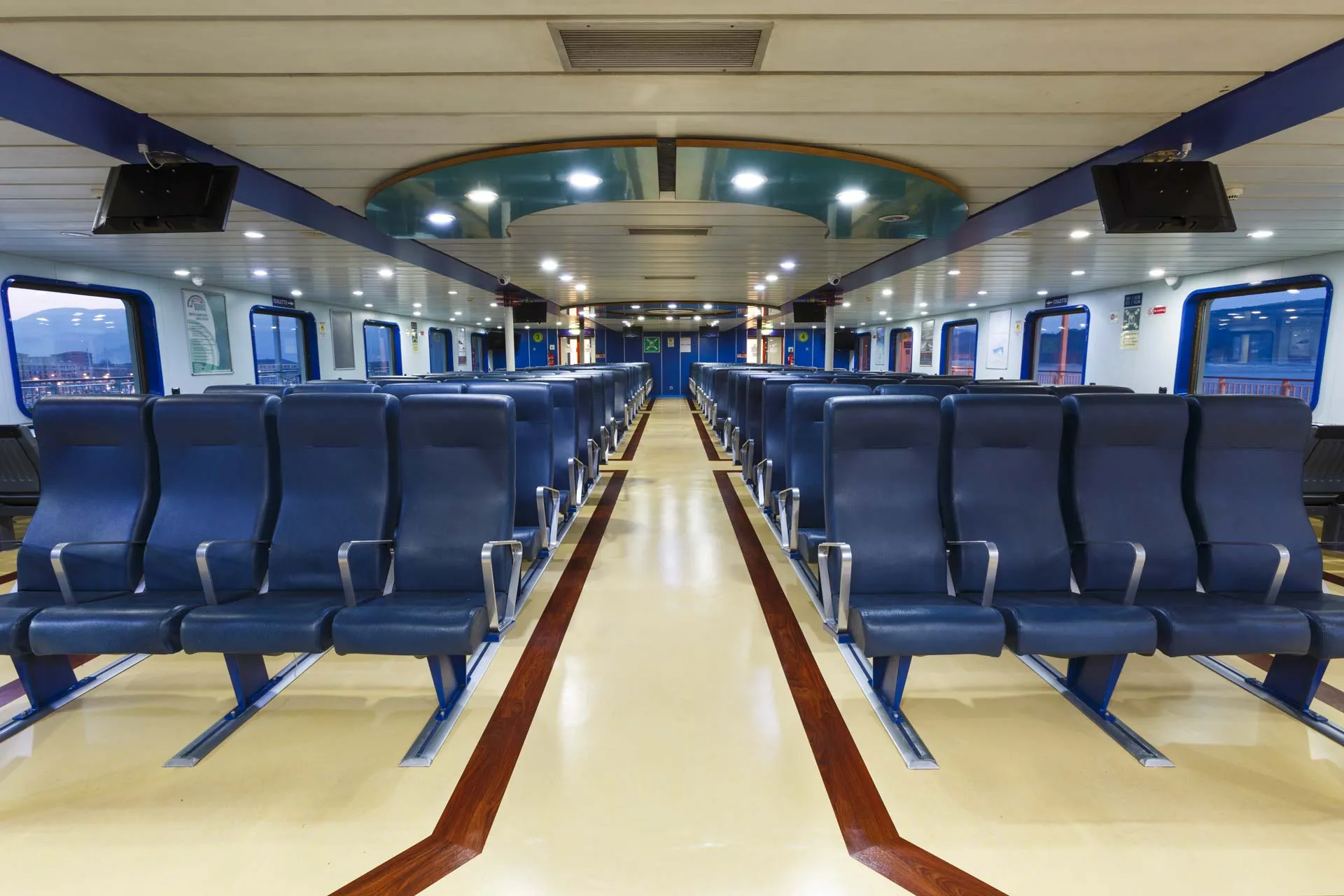 La nave offre ampie aree comuni con sedute confortevoli, consentendo ai passeggeri di godere del viaggio in relax e con vista sul mare.