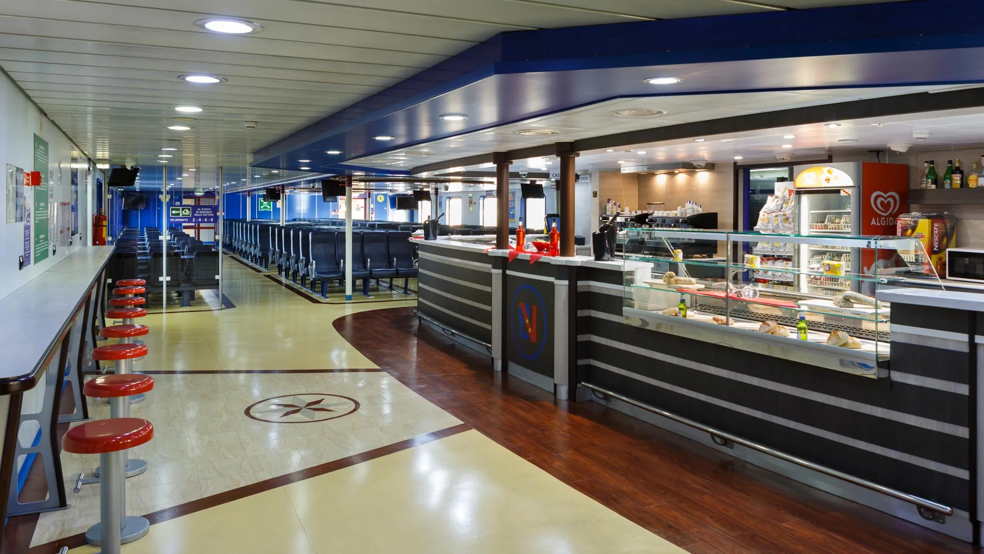 Il bar della nave propone varie opzioni di snack e bevande, soddisfacendo le necessità di rinfresco dei passeggeri durante la traversata.
