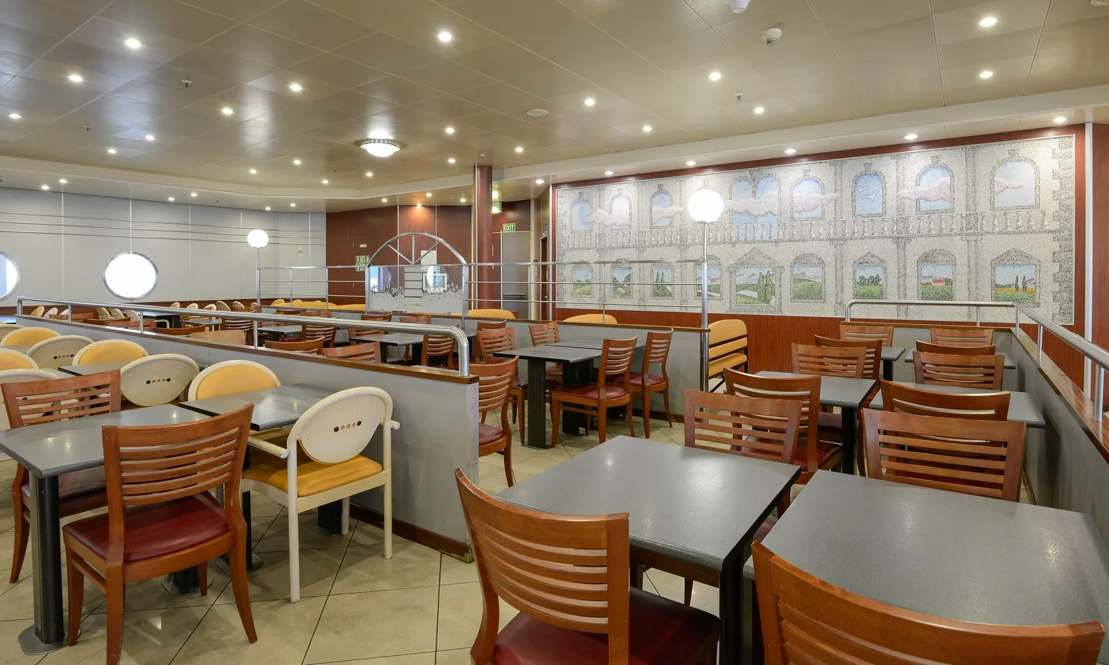 A bordo si trovano diversi punti ristoro che offrono una varietà di opzioni culinarie, da piatti veloci a cene più raffinate, per soddisfare i palati di tutti i passeggeri.