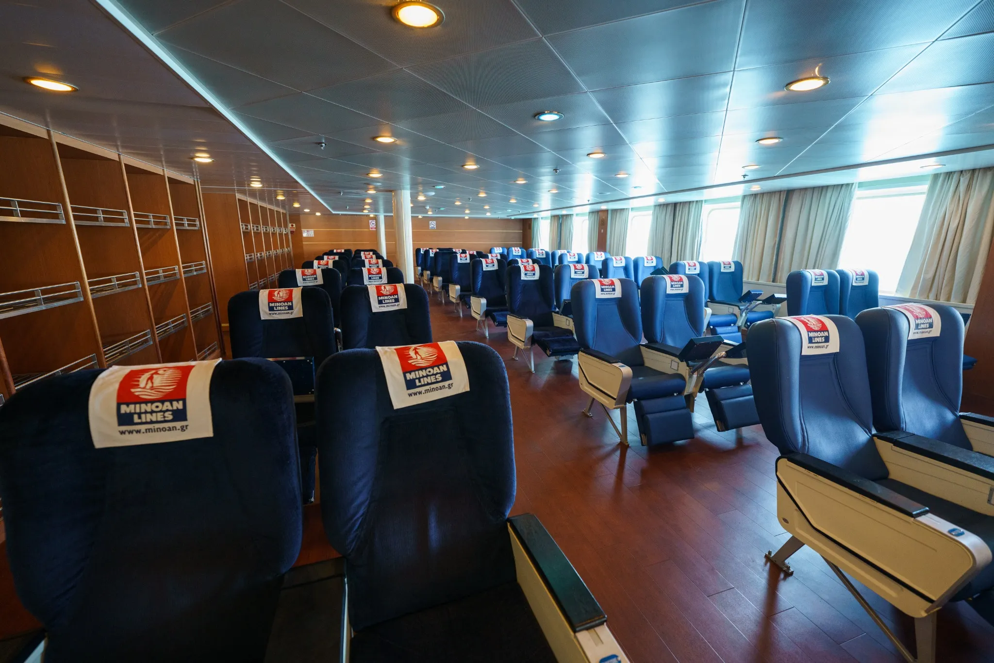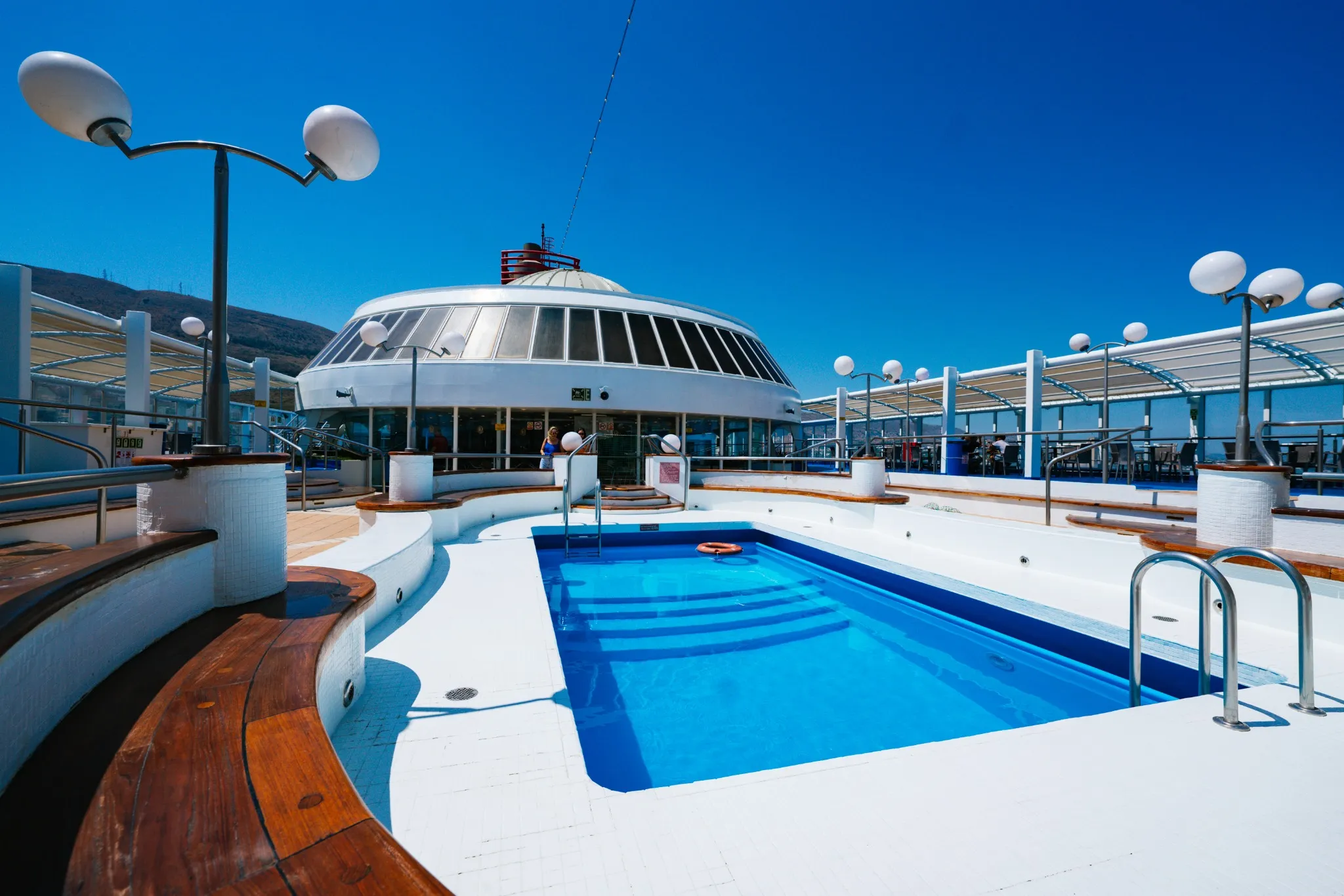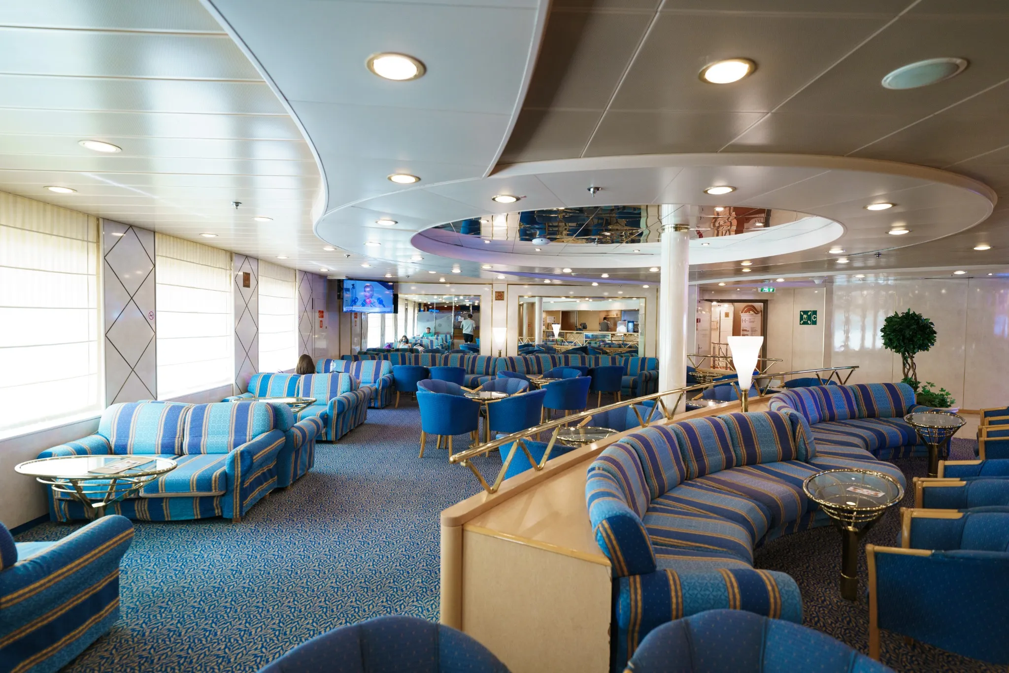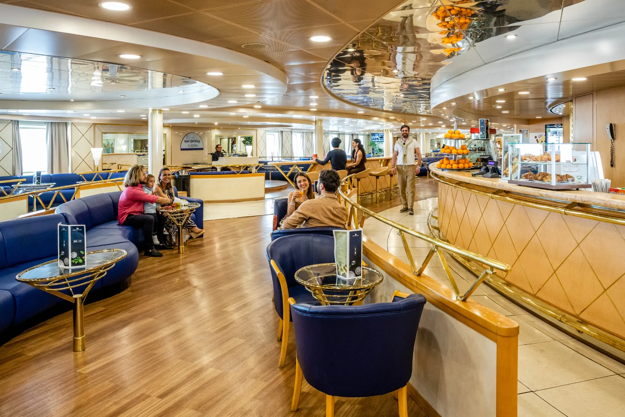 Ampie terrazze all’aperto permettono ai passeggeri di godere del panorama marittimo, con aree attrezzate per il relax e il sole.
