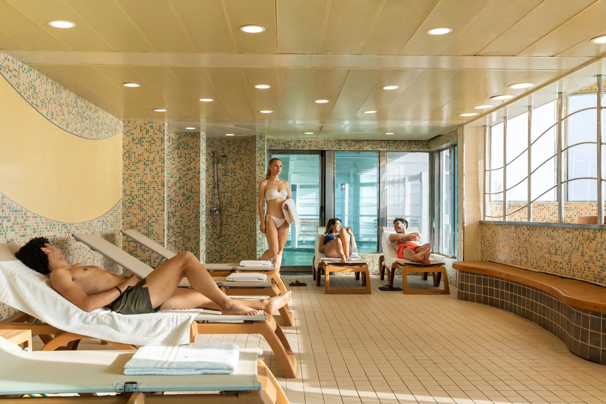 Vaste aree esterne offrono agli ospiti la possibilità di rilassarsi al sole o di ammirare il panorama del Mediterraneo durante la navigazione.