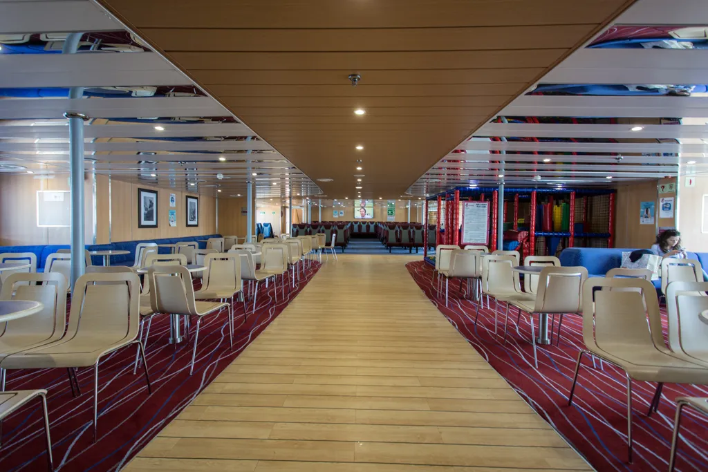 La nave offre ampie e confortevoli sistemazioni con poltrone e una sala climatizzata per i passeggeri, oltre a spazi esterni per chi desidera godersi il viaggio all’aria aperta.