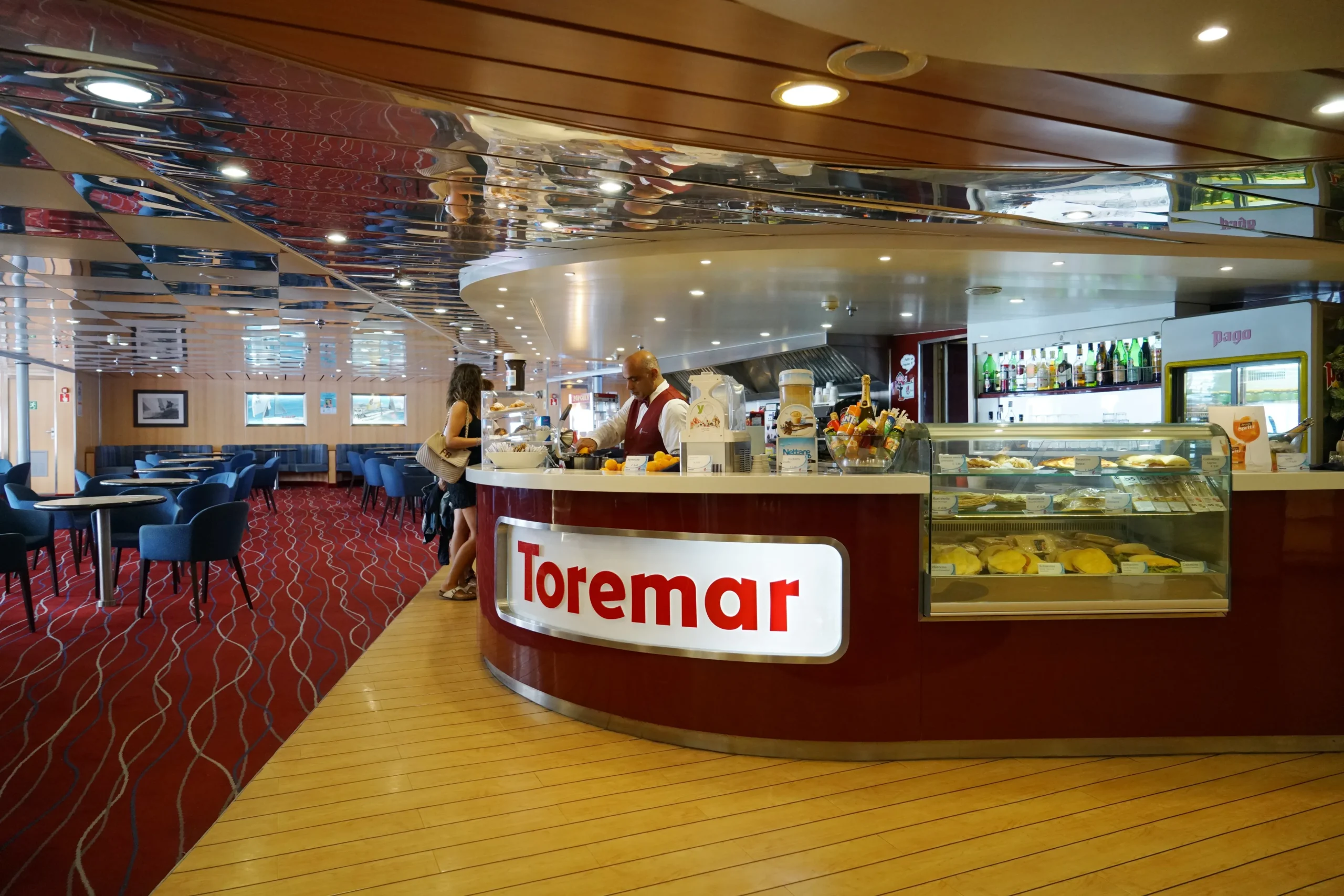 Il bar caffetteria a bordo propone un’ampia gamma di snack, panini e bevande, sia calde che fredde, pensati per chi cerca un pasto veloce o una bevanda rinfrescante durante la traversata.