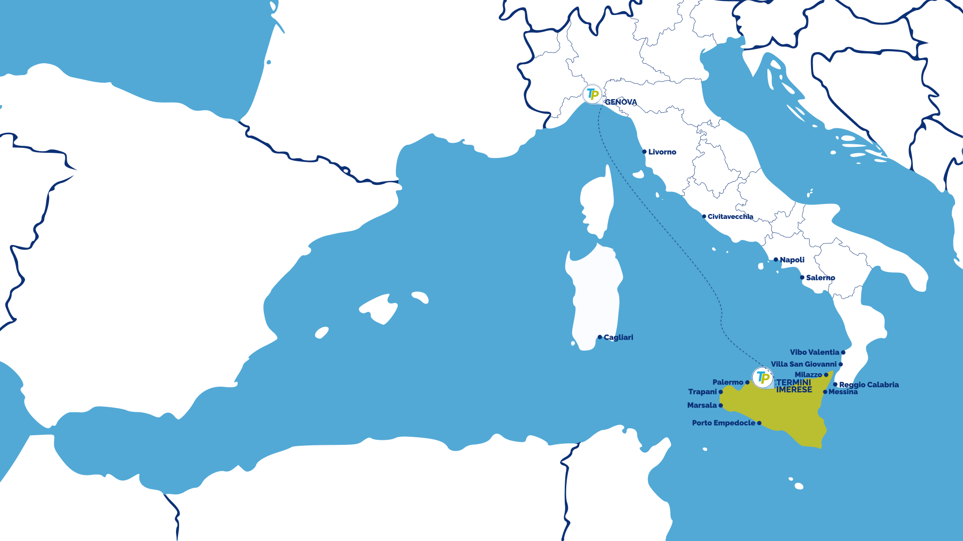 Il traghetto da Genova a Termini Imerese collega la Liguria alla Sicilia da metà giugno a metà settembre con 3 viaggi a settimana. La durata media della traversata è di circa 20 ore e 30 minuti.